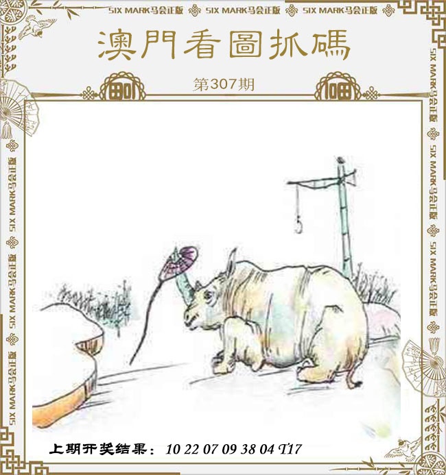 【抓码图】307期:图中一头大犀牛俯卧在地上,后面竹竿上挂着个数字5,解牛龙狗羊蛇鼠。